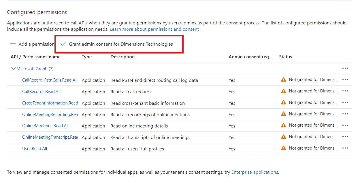 To allow the name of the meeting to be set against the call model, can create a "Application Access" policy in Azure to allow the ~.Dimensions.~ client access to it.